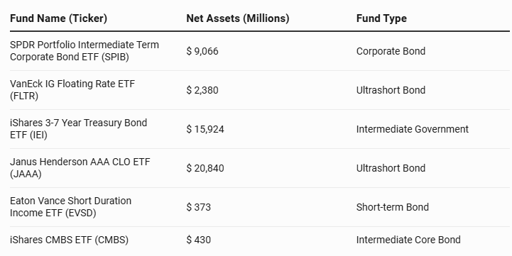 Below is a list of six fixed-income ETFs that have mid-length maturities, low fees, and strong performance. They are listed from the lowest to the highest fee.