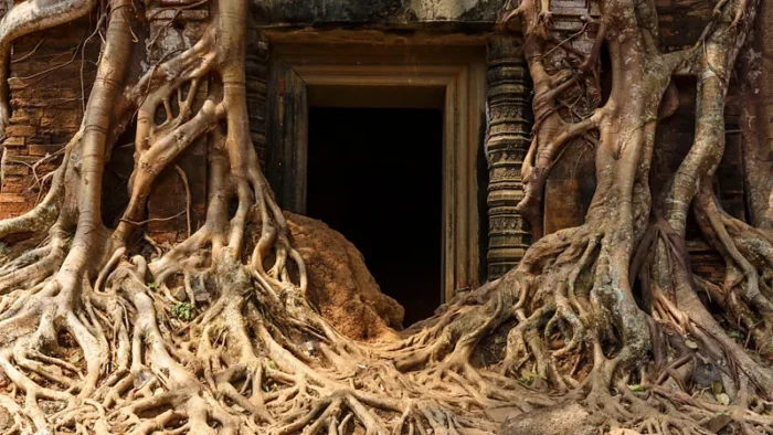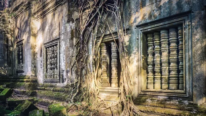 Constructed around the same time as Angkor Wat, Beng Mealea is believed by many to have been a prototype for the capitol. The temple is mysterious and romantic, virtually untouched. Silk cotton trees entwine the stone ruins, their roots sprawling across the ground like the greedy claws of a giant lizard. Menacing strangler figs appear to burrow into the earth, reclaiming their place in the underworld.