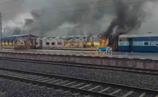 In Uttar Pradesh, a crowd entered a train terminal in Ballia this morning and set a train ablaze, as well as also damaged railway station property before the police used pressure to disperse them.