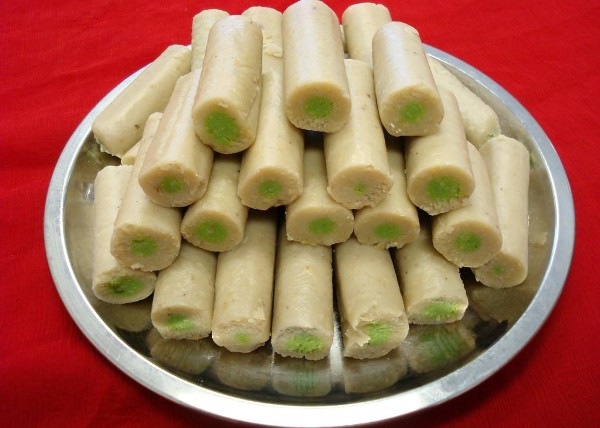 Roll-shaped dough made from cashew nuts that has actually been filled with delightful pista dental filling. To enjoy its flavour, garnish with saffron threads and silver warak.