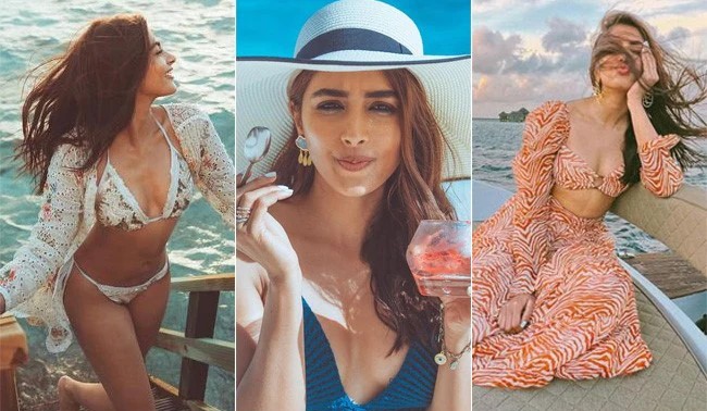 The actor wore an ivory coloured two-piece swimsuit set on her vacation to Maldives as well as made us want to take a vacay instantly. The tropical published swimwear had shoelace boundaries. She put on a halter neck top with a reduced midsection base and also styled it with a full-sleeved cutwork t shirt Her open beachy hairs completed her beach look.