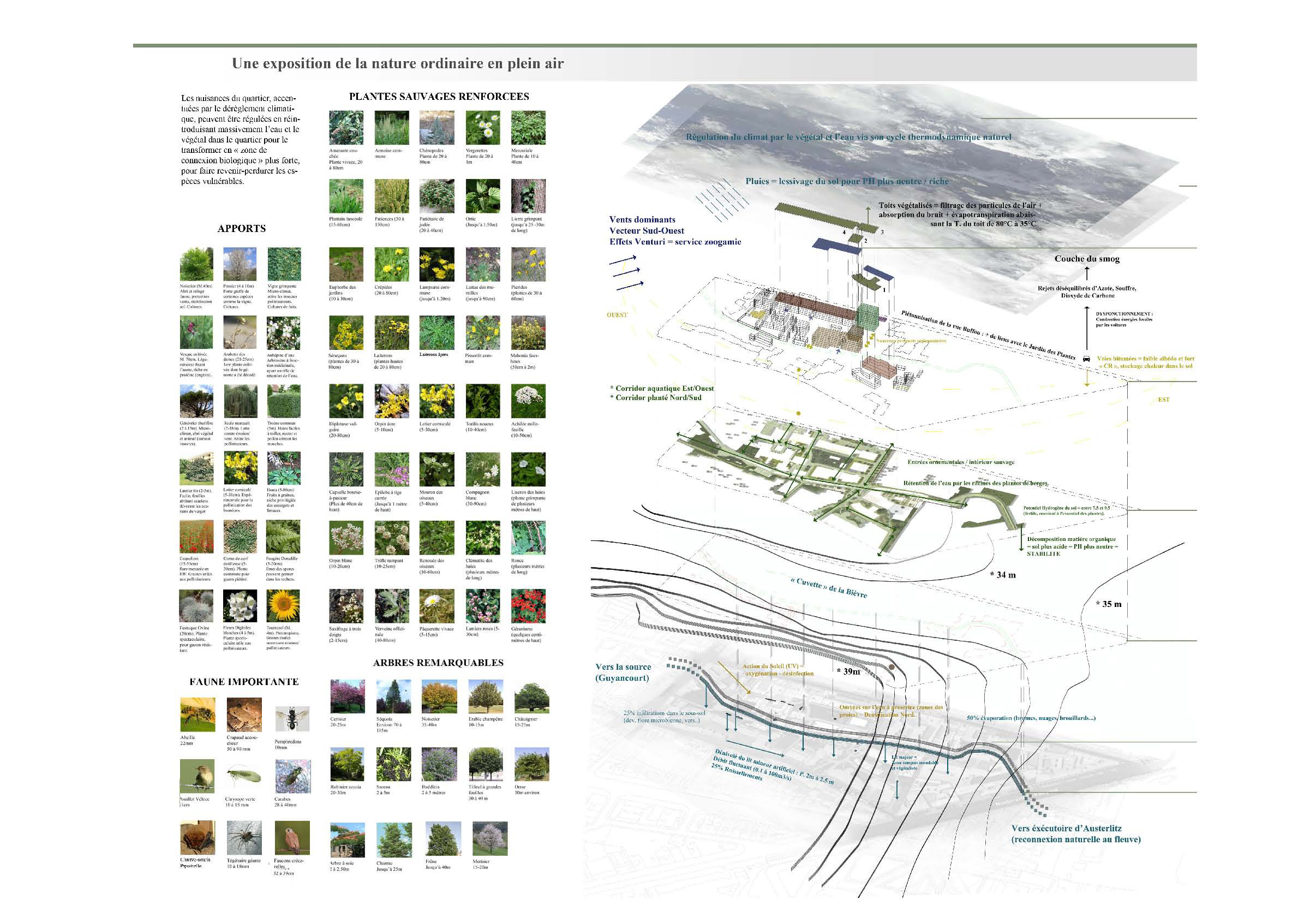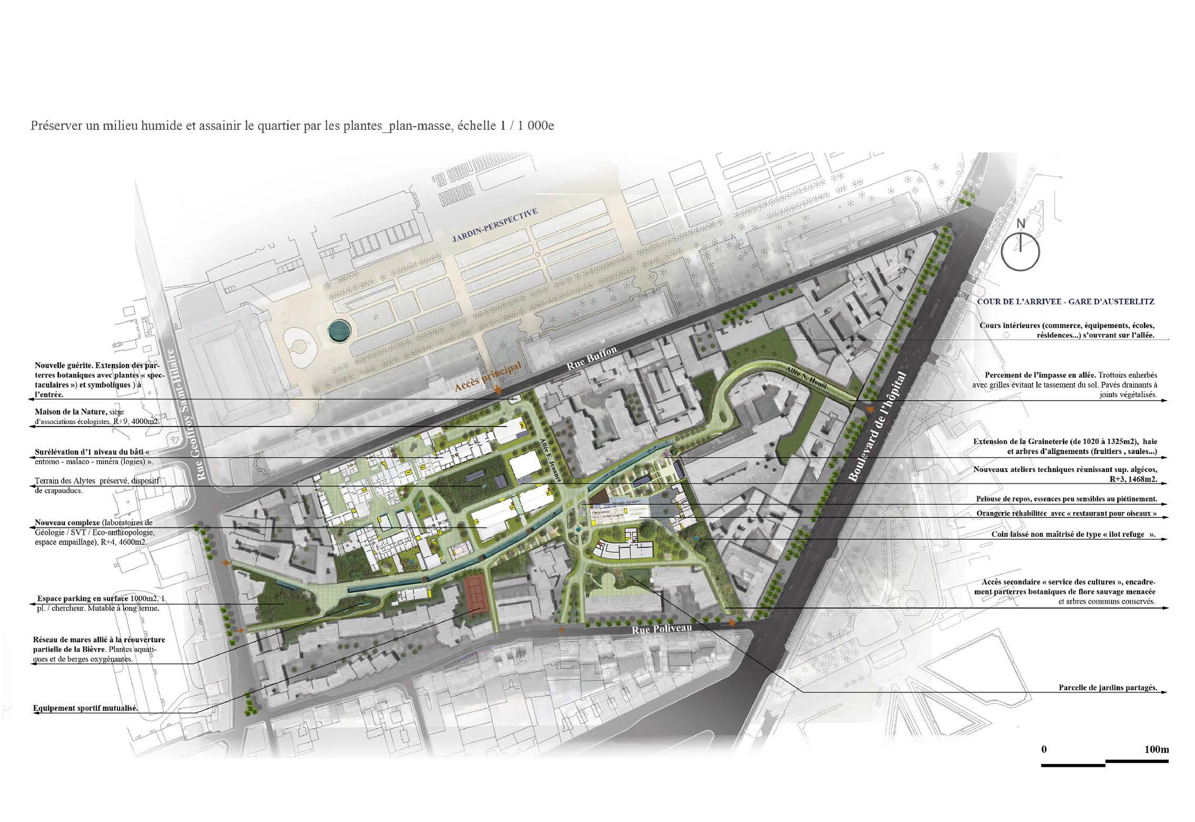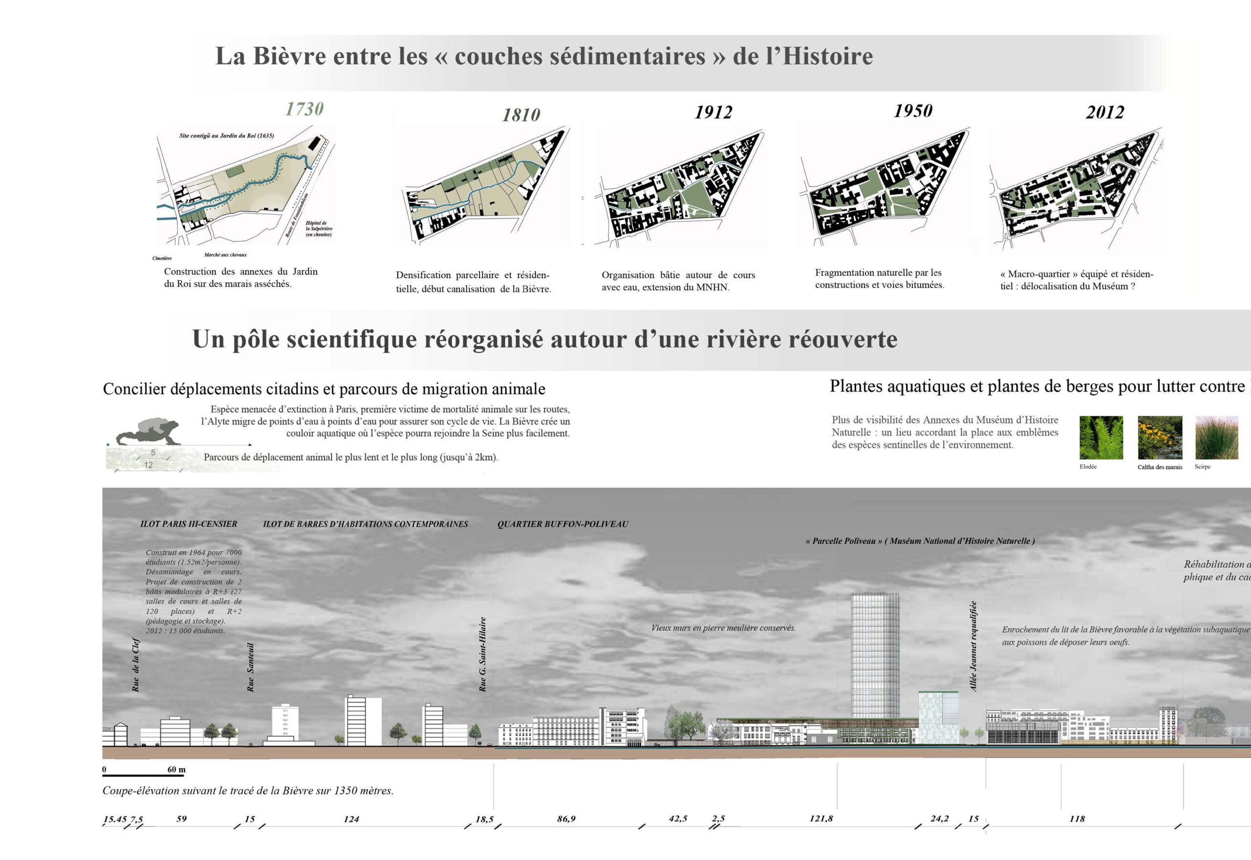 The following State architect’ diploma (PFE) focuses on an alternative planning of the Buffon-Poliveau’ district (Paris 5e). Confronted to increasing density among the core of this discrict, this project aims to create innovative design, green public spaces while preserving and enhancing the existing nature (seed zones, remarkable trees and vegetation, wildlife protection zones …). This urban project also emphasizes the rehabilitation of existing buildings where researchers from the National Museum of Natural History (MNHN) are working.