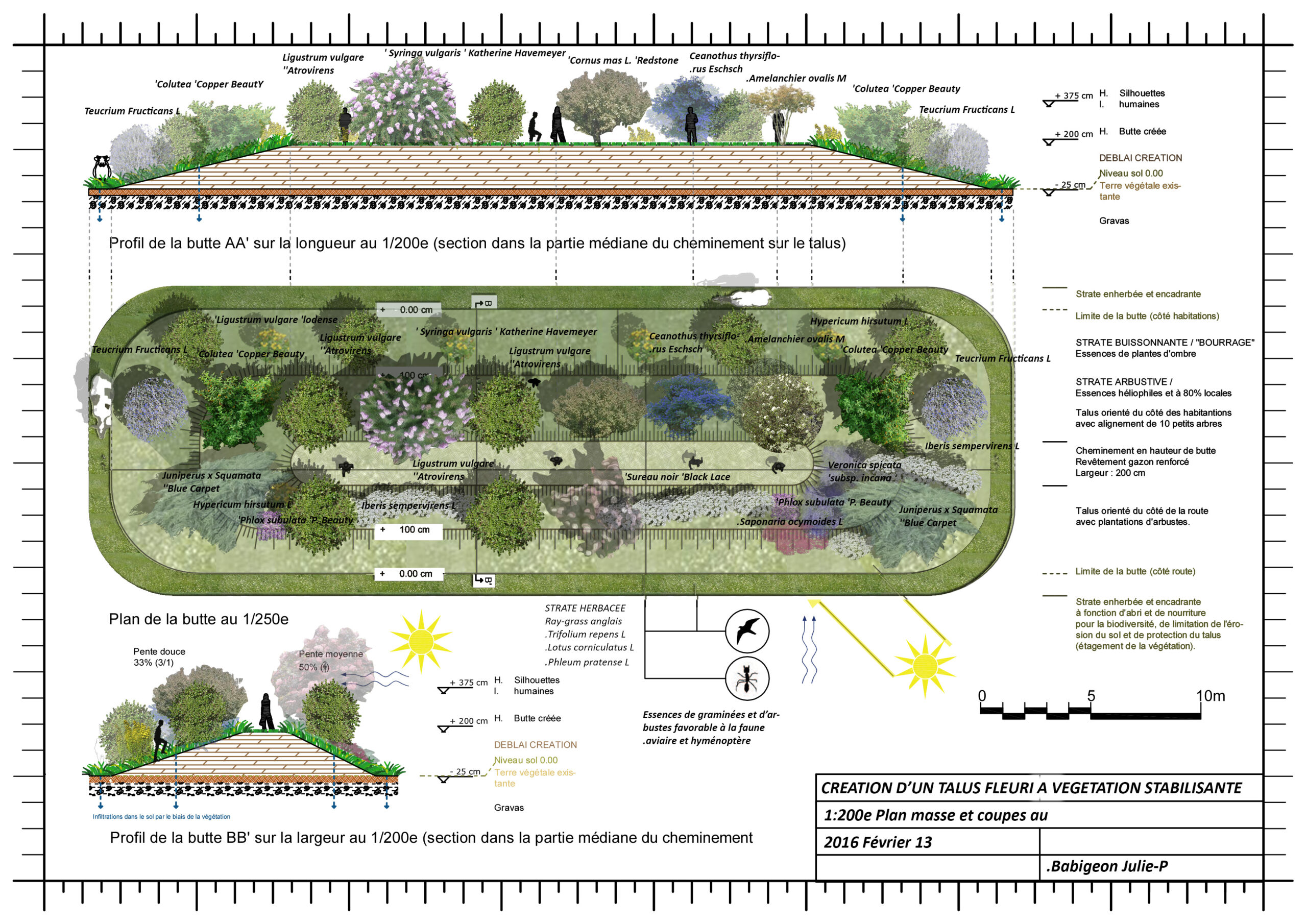 The slope project consists of herbaceous, shrubby and arboreal layers featuring grass species and shrubs that benefit to avian and hymenopteran wildlife (providing shelters and foods). The herbaceous layer helps to limit soil erosion and protects the slope through a stratification of vegetation. The shrubby layer is composed of heliophilic species with 80% local. Finally, the underbrush layer or “filling” includes shade plants species.