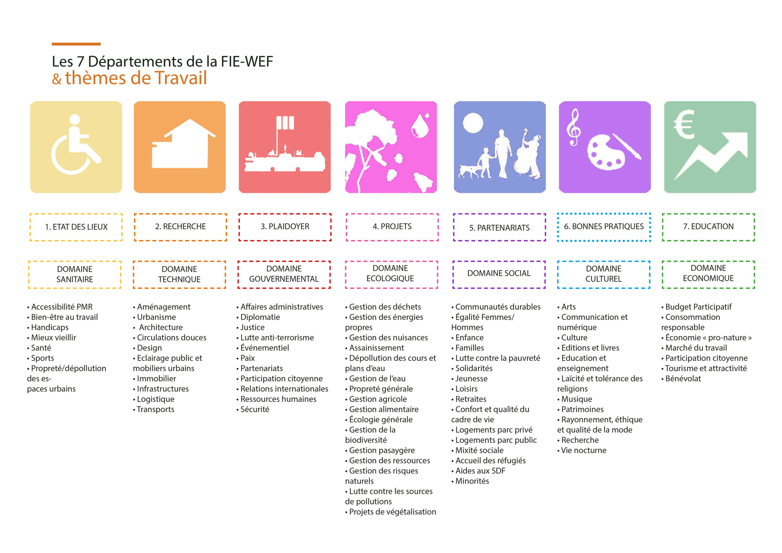 - Like the 7 poles/départments of the “FabLab Divine Nature”, the FIE-WEF is organized around seven subjects of work (diagnostics, research, advocacy, projects, partnerships, best practice exchanges and educational actions/events) ;
