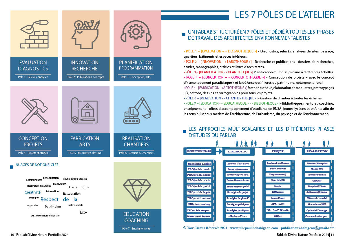 Finally, I decided to found a FabLab entitled “Divine Nature” on 2024, June 13th, which serves as both as a fabrication’ space and as a research laboratory focused on ecological planning. The slogan of the FabLab is: “Creating Built Environments for Everyone and that Respect Life”. Having inspired the local FabLab of the City of Sarlat in Dordogne, my project is structured around seven thematic “poles” or departments dedicated to all phases of the works of the eco-architects: