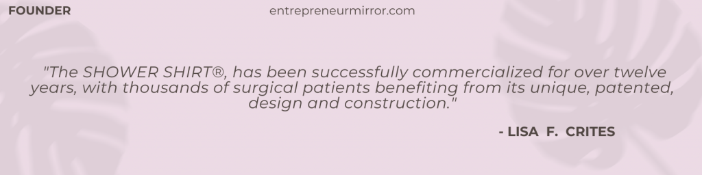 We recently had the opportunity to interview Lisa F. Crites, the Founder of an innovative, water-resistant garment to support the home-medical apparel industry, The SHOWER SHIRT®. A former health/medical journalist and breast cancer survivor, Lisa soon realized the gap in water-resistant products for chest surgery patients in the market, which created an opportunity to design, invent, and develop a product which marked the beginning of her entrepreneurial journey.