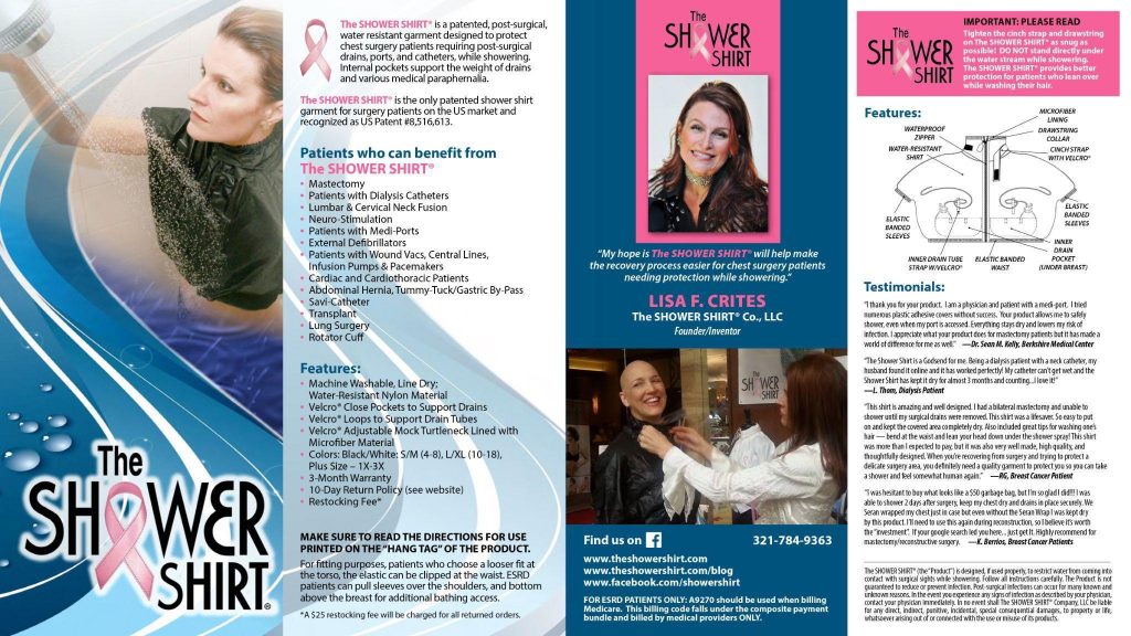 “However, the use and benefits of The SHOWER SHIRT® have extended well beyond just mastectomy patients. Renal dialysis patients and other patients with catheters, wound vacs, infusion pumps, central lines, external defibrillators, and chemo pumps can take advantage of the product, not to mention those undergoing surgeries such as abdominal, hernia, lung surgery, life-vest, cardio-thoracic surgery, rotator cuff surgery, and bariatric surgery, to name a few.