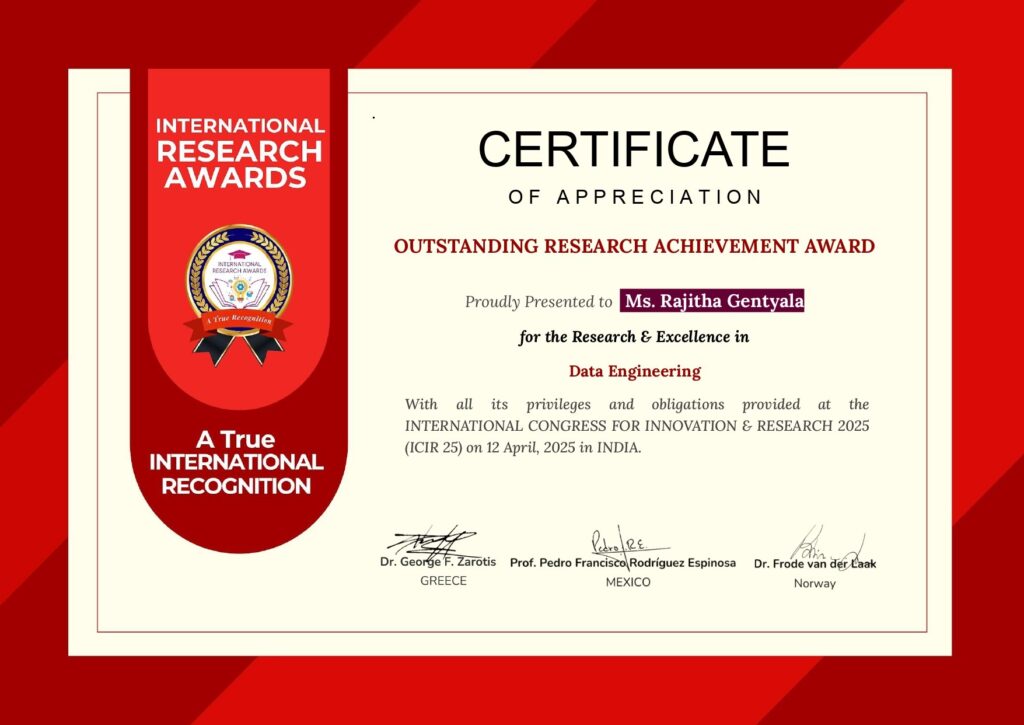 Rajitha Gentyala was honored with the Certificate of Appreciation for the Outstanding Research Achievement Award in recognition of her Research and Excellence in Data Engineering at the INTERNATIONAL CONGRESS FOR INNOVATION & RESEARCH ICIR 25, held on 12 April 2025 in India