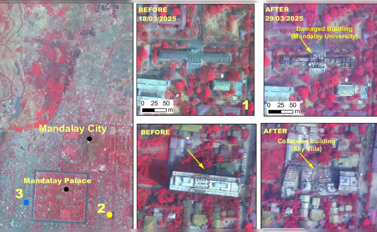 The images showed heavy damage in Mandalay, with famous places like Sky Villa, Phayani Pagoda, Mahamuni Pagoda, Ananda Pagoda, and the University of Mandalay either fully or partly damaged.