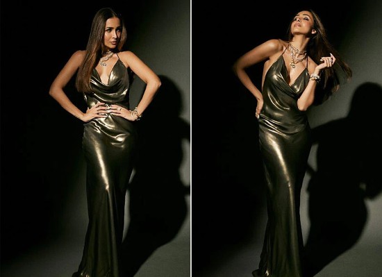 The backless metallic dress was body-hugging and highlighted Malaika’s well-toned body. For accessories, the star used a metal split necklace and bracelets. Maintaining the make-up dewy, Malaika went with intense eyes, glossy lip color and well-contoured cheekbones.