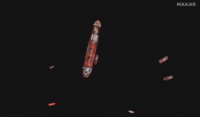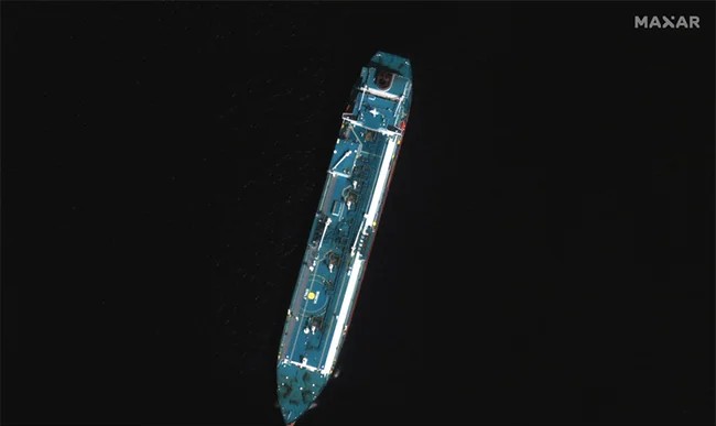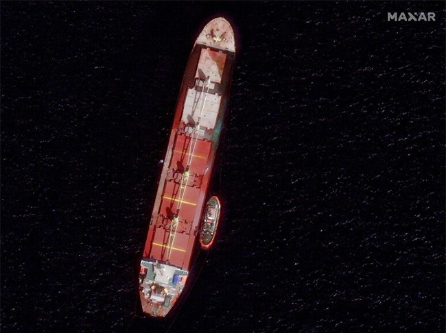 The ship is partially submerged with water covering the bow area and also is supposedly hing on the seabed at a depth of approximately 17 metres. The LNG tanker, likewise seen in today’s satellite photo, is positioned southwest of the port and also reportedly only endured minor damages to the bow as a result of the crash.