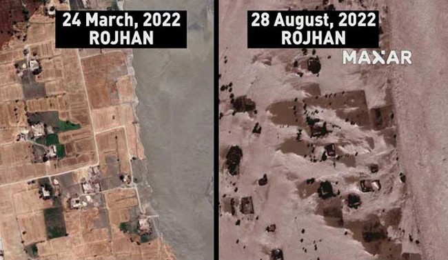 The pictures show some of the flooding near the city of Rojhan from today and a comparison of the very same location with a photo taken earlier this year (March 24).