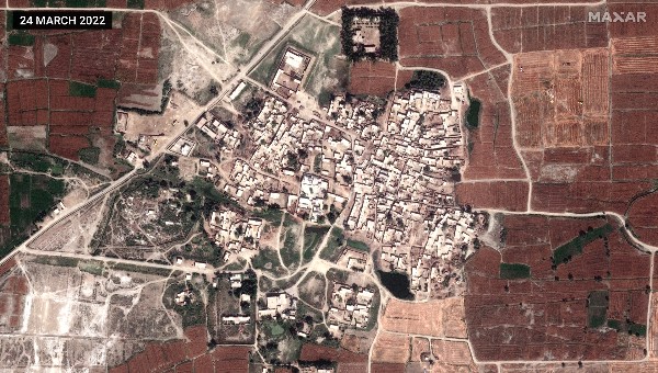A village is seen before the floods as well as after being bordered by the flood water.