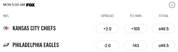 Point spread: Eagles -1.5 (Eagles favored to win by more than 1.5 factors, otherwise Chiefs cover).