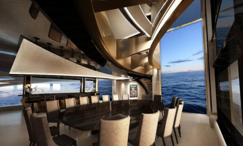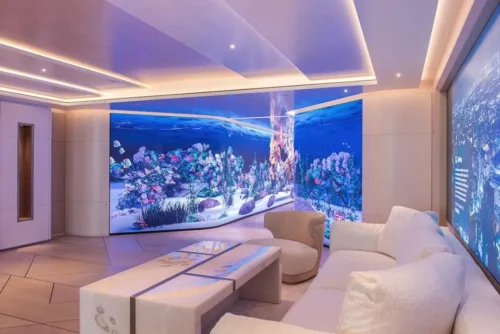 As you’d expect, this yacht has everything. It features open-air dining on five decks, a dining room with soaring 18-foot ceilings on the main deck, a sushi bar, and a pizza oven next to the large pool. For party time, there are DJ stations, of course. There’s even a massive cinema on the lower deck with seating for 19 guests—perfect for a relaxed Netflix-and-chill evening.