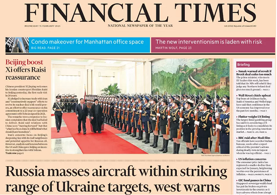 The lead tale in the Financial Times states that, according to Western intelligence, Russia is massing aircraft within striking series of Ukraine, suggesting that Moscow is preparing to escalate its assaults on the country as the one-year anniversary of the battle approaches. The paper's major…