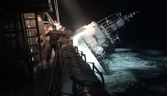The navy published images as well as video footage on its Twitter account showing a team of employees in orange vests in a black inflatable raft relocating away from a ship in darkness as waves swelled around it. It was not immediately clear the number of boatings had been deployed.