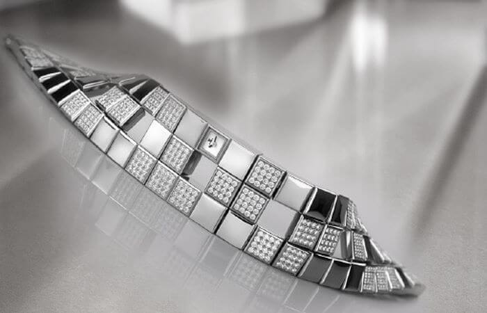 The watch is made from white gold and has a sleek hand-wound mechanism with a sapphire glass cover. It features 577 diamonds, making it exceptionally luxurious.